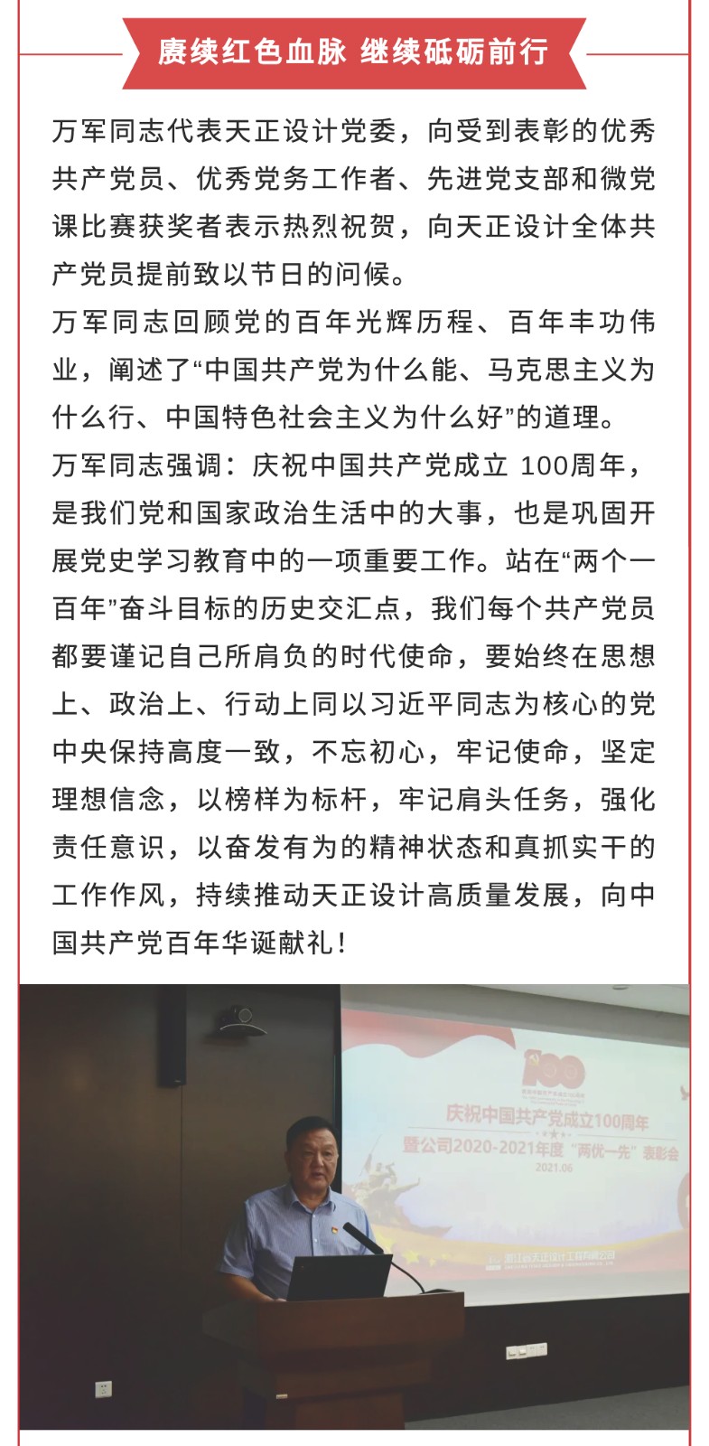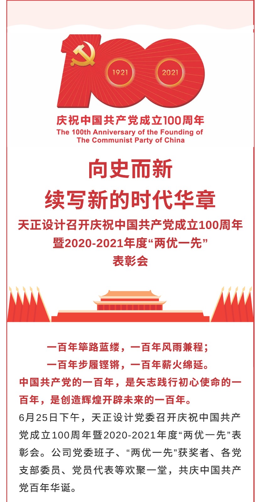 向史而新,續(xù)寫新的時代華章——天正設(shè)計召開慶祝中國共產(chǎn)黨成立100周年暨2020-2021年度“兩優(yōu)一先”表彰會